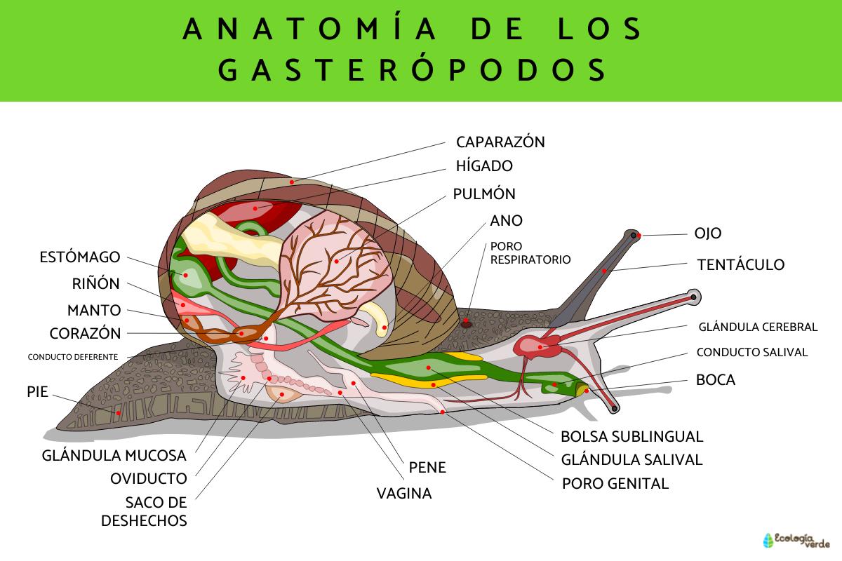 A pesar de ser un grupo muy grande y muy variado, todos los gasterópodos tienen unas características físicas básicas muy similares que los hacen fácil de distinguir. Así pues, el cuerpo de estos animales se puede dividir en partes muy claras: