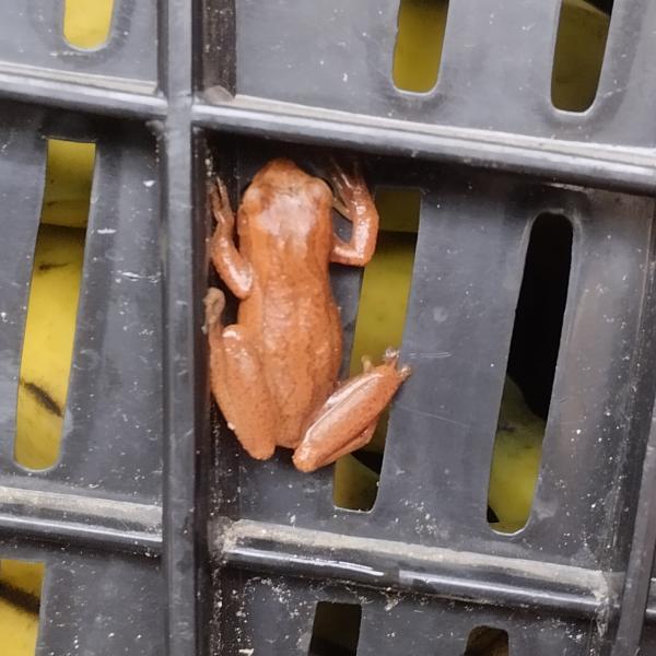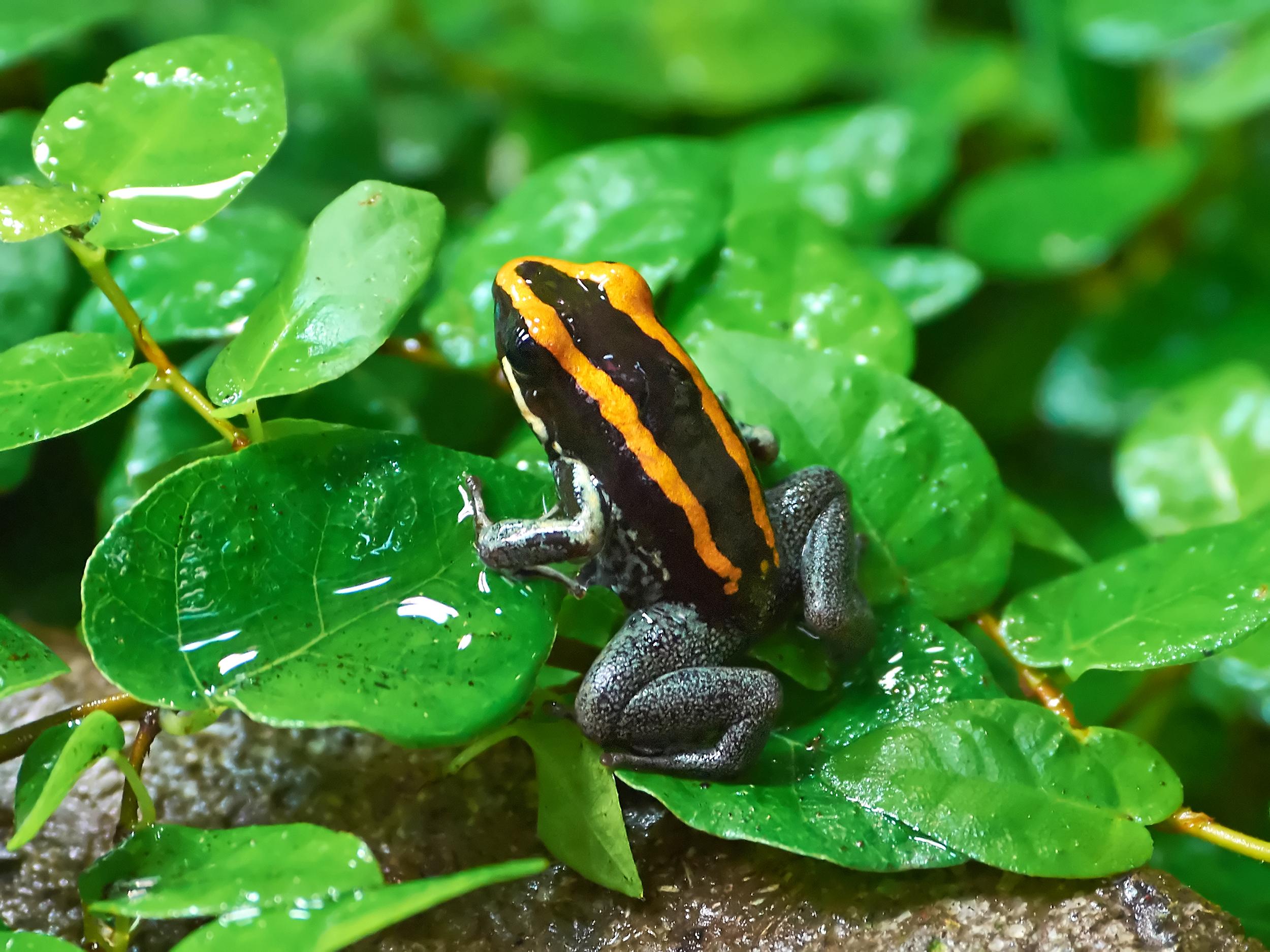 A pesar de que esta rana es venenosa, utiliza el mimetismo mülleriano para copiar los patrones y colores de otras especies de ranas venenosas para confundir y protegerse de depredadores.