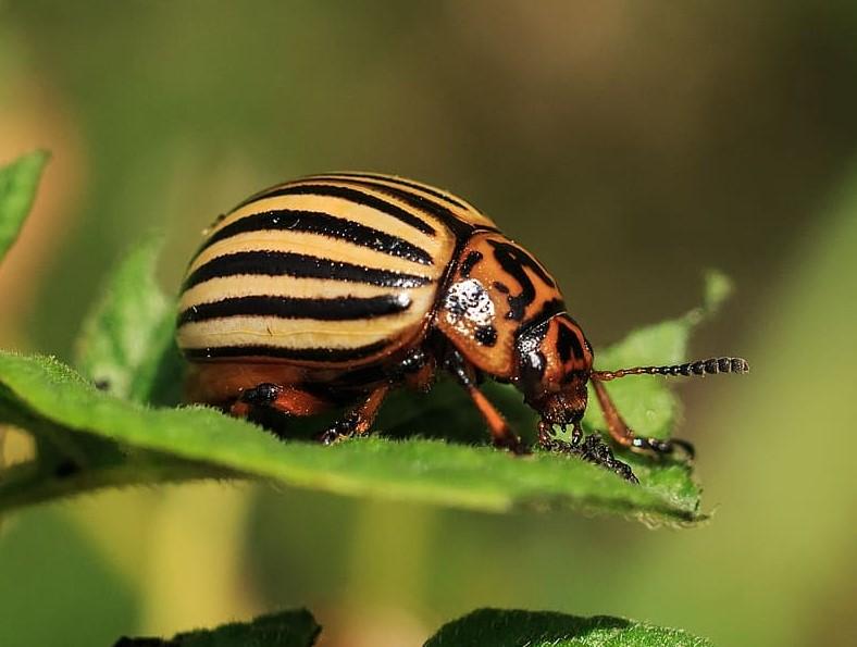 El escarabajo de la patata, de nombre científico Leptinotarsa decemlineata, es un insecto coleóptero que resulta muy dañino para para las patatas y otras plantas de su familia. Su enorme capacidad de reproducción y gran voracidad lo convierten en una de las plagas más peligrosas del huerto, que puede dejarnos en muy poco tiempo nuestras solanáceas sin una sola hoja. A simple vista es un insecto con una forma que puede recordar a la de las mariquitas, aunque su caparazón es amarillo y tiene diez líneas negras, de ahí su nombre científico.