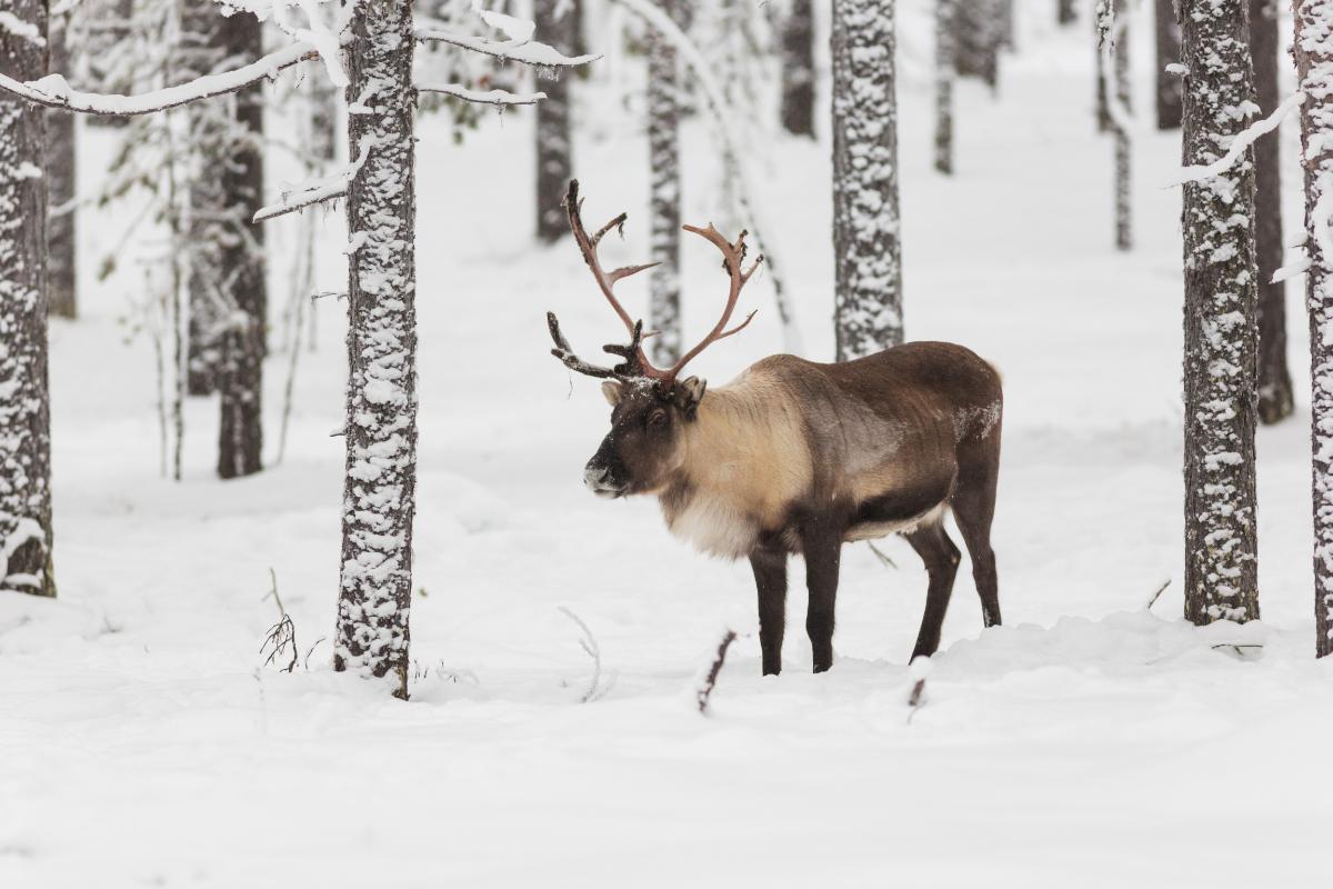 El reno, de nombre científico Rangifer tarandus, es un cérvido típico de lugares fríos, como la taiga y la tundra ártica, que ha sido parte de múltiples cuentos navideños por vivir en sitios con nieve y su gran porte y tamaño. Mide entre 1.5 y 2.3 m de largo y 1.2 m a la cruz. Son animales rumiantes y suelen tener una cría por hembra al año.