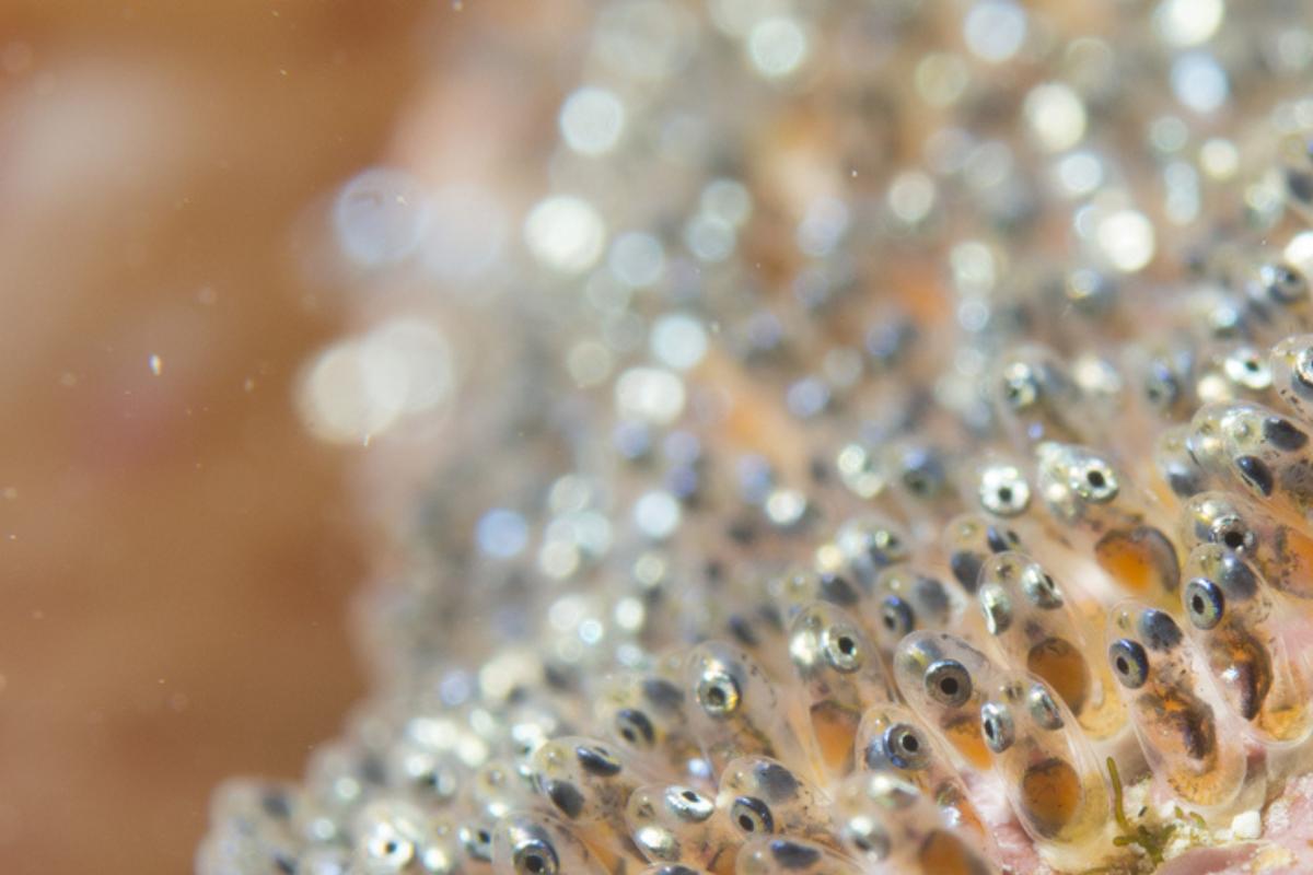 Estos huevos no flotan y son grandes. Por el contrario, los huevos de peces que viven en la columna de agua sí flotan y son pequeños.