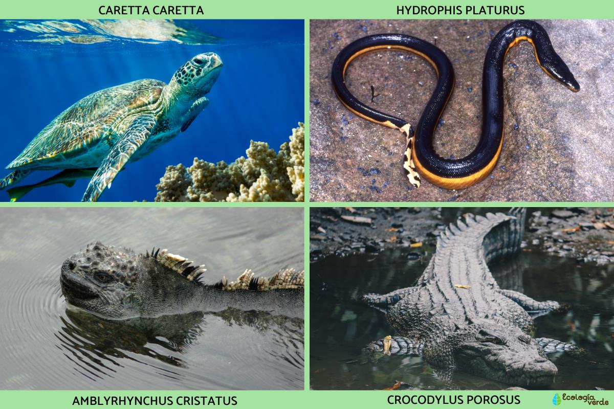 Por ejemplo, las serpientes de los géneros Acrochordus y Cerberus pueden permanecer sumergidas alrededor de media hora, mientras que la tortuga verde marina puede hacerlo hasta por 50 minutos. Las serpientes marinas, en particular, poseen un pulmón alargado que se extiende a lo largo de su cuerpo, lo que les permite almacenar grandes cantidades de oxígeno.