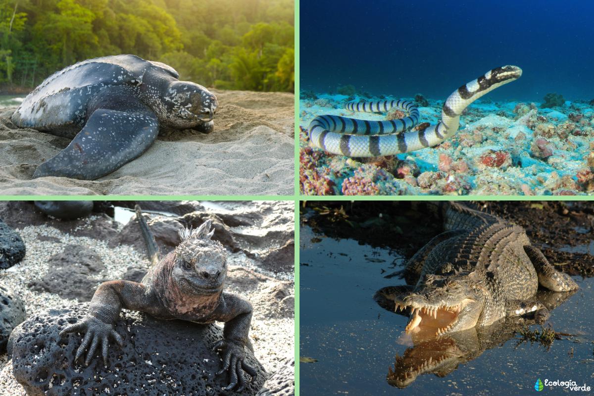 - Tortugas marinas: pertenecientes al orden Testudines. Poseen cuerpos aerodinámicos y extremidades transformadas en aletas, lo que les permite nadar de manera eficiente. Se encuentran en todos los océanos, excepto en las regiones polares, y su dieta varía desde plantas marinas hasta invertebrados y peces. Las siete especies de tortugas marinas, como la tortuga laúd (Dermochelys coriacea), pueden pesar hasta 700 kg y alcanzar longitudes de 2,2 m. Descubre Cómo nacen las tortugas marinas.