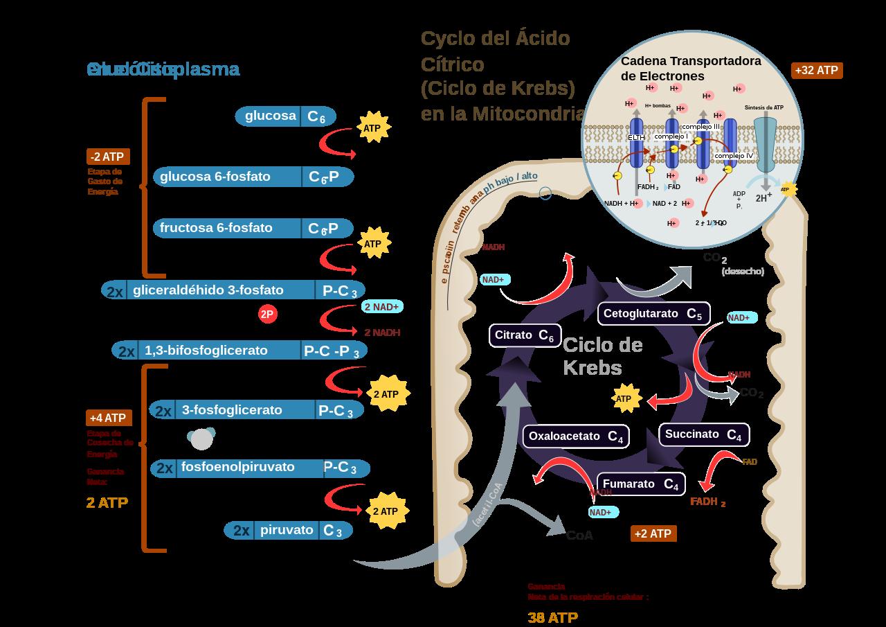 - Glucólisis: la glucólisis comienza con los alimentos que ingerimos, específicamente de los carbohidratos hechos de glucosa. Estos carbohidratos son procesados en el estómago y enviados a la sangre. Con ayuda de la insulina se introducen a la célula, pues aquí se lleva a cabo la glucólisis. Ya en la célula, esta glucosa va a ser descompuesta con ayuda de enzimas en una molécula más sencilla: el piruvato. Tal proceso libera además dos moléculas de ATP, y NADH. En total se obtienen 2 piruvatos, 2 ATP y 2 NADH.