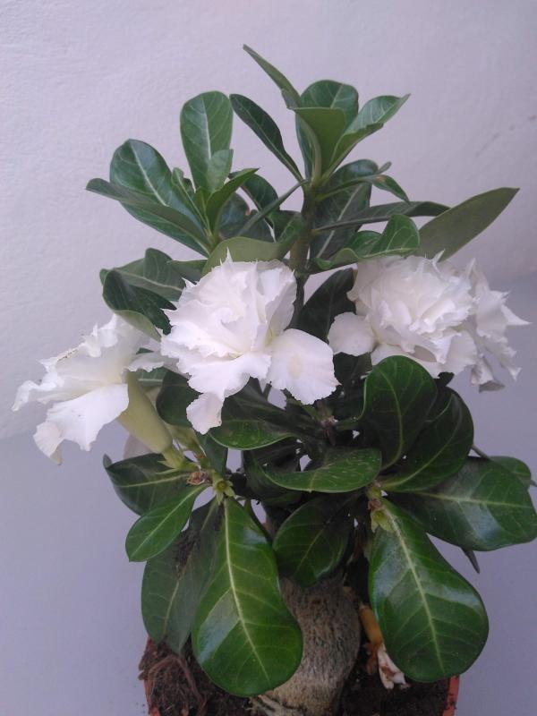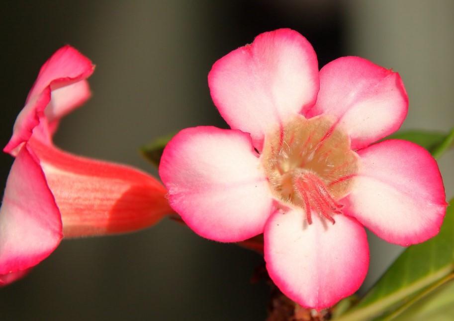 - La adenium da unas llamativas flores tubulares con cinco pétalos, habitualmente de un color rosa muy intenso y bonito, aunque también pueden ser rojas o blancas.