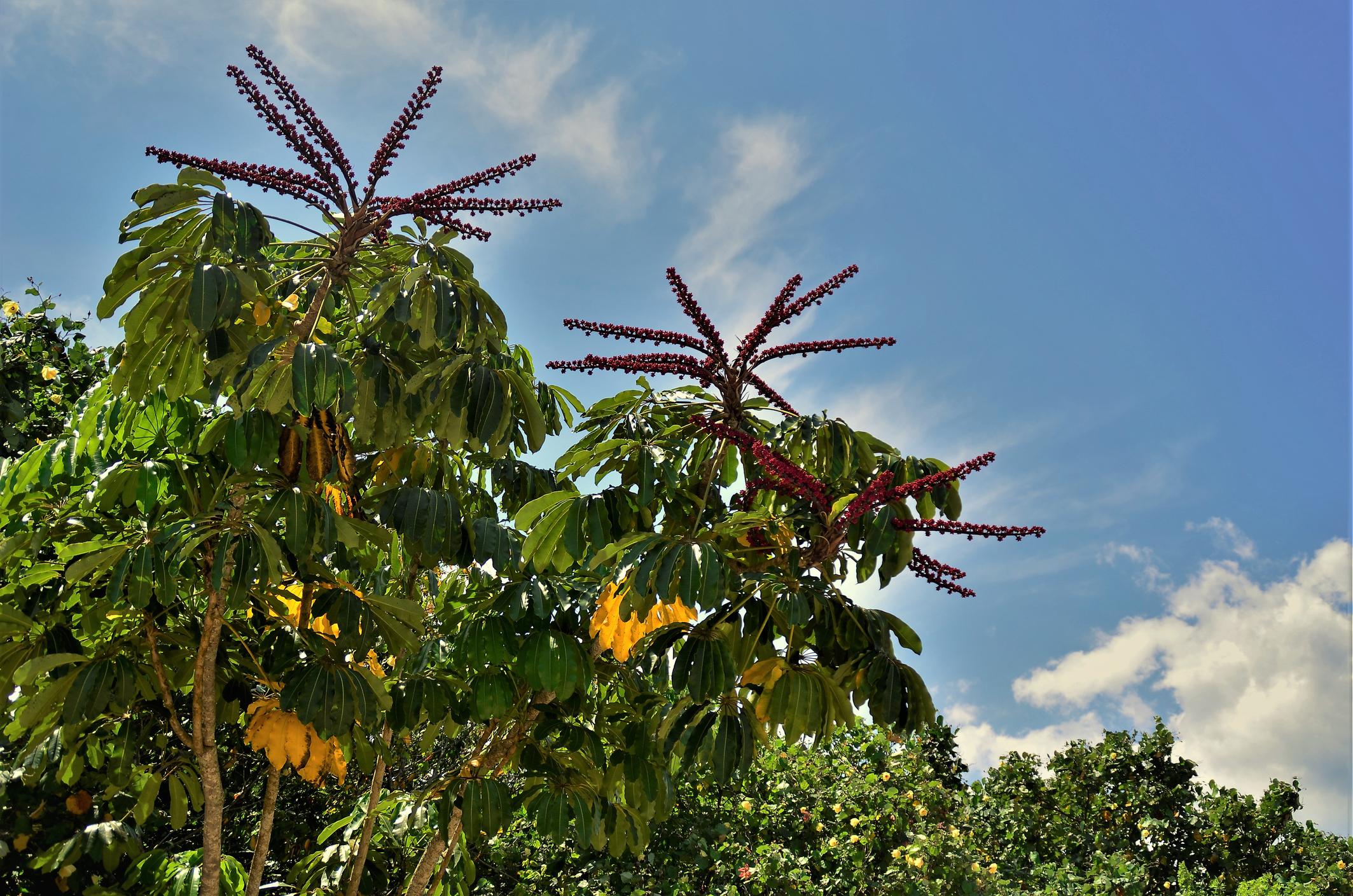 - Las hojas compuestas y palmadas están acomodadas en racimos de 6 a 9 hojas individuales en torno a un peciolo de 12 centímetros de largo, recordando a un paraguas. Estas hojas tienen apariencia lacada, muy brillante y de color verde intenso.