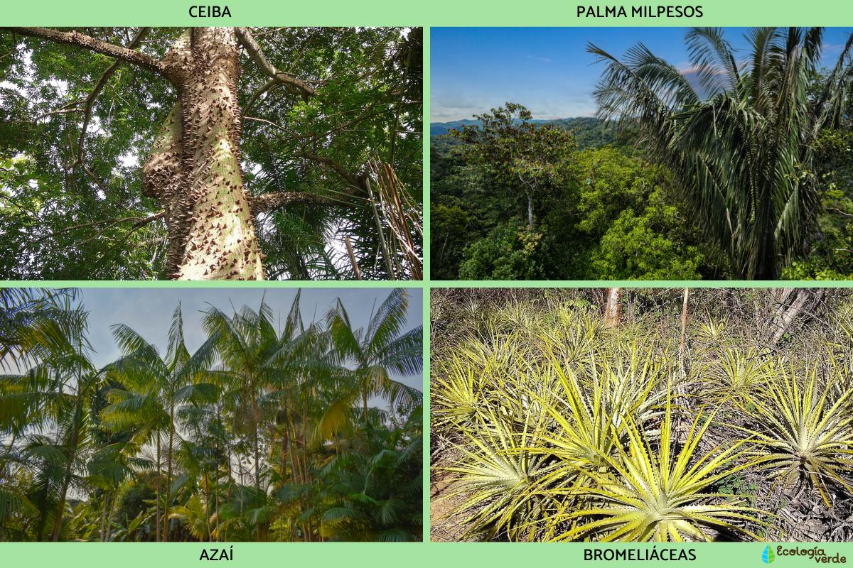 Por lo general, debido a la falta de estacionalidad del clima, la vegetación no presenta periodicidad y los árboles son siempre verdes de hojas anchas. En la selva existen diversos estratos arbóreos difíciles de identificar, entre ellos: