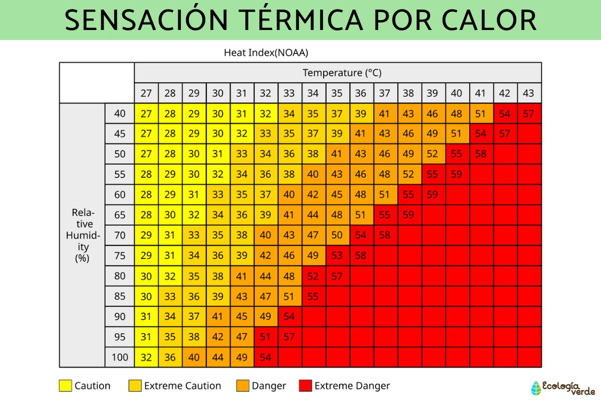 La sensación térmica se calcula con el Índice de Calor, que relaciona la temperatura y la humedad relativa. Una de las fórmulas aproximadas es:
