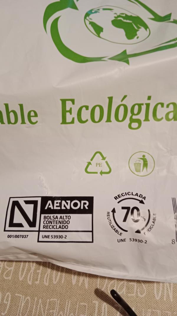 Esta es una bolsa de plástico, 70% reciclado. En el símbolo de reciclado pone solamente PE. Indica que es ECOLÓGICA. No sé si entiendo mal el concepto, pues cómo siendo plástico, por muy reciclado que esté, puede ser ecológica, nadie puede garantizar que acabe en el mar, o rodando por el campo, o quemada. Gracias por vuestro trabajo.
