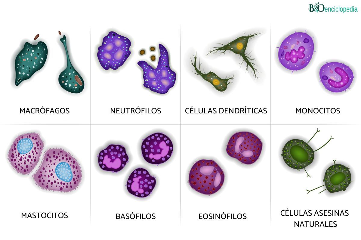 - Inmunidad innata: es la defensa con la que nacemos todos. Está conformada por distintos tipos de glóbulos blancos: fagocitos, células NK, basófilos, eosinófilos, etc.