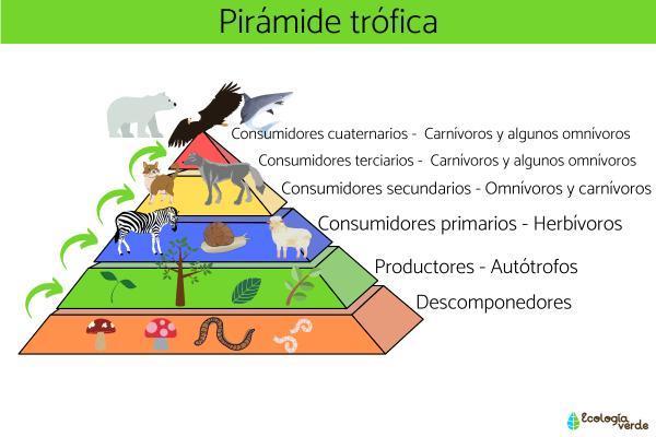 La energía que tomaron los productores se va perdiendo o eliminando progresivamente al pasar por cada uno de los grupos descritos. ¿Por qué sucede esto? Se debe a que los organismos invierten esa energía para poder moverse y generar calor, así como para crecer y reproducirse. Esto da lugar a una estructura piramidal de los sistemas ecológicos, en donde los productores estarían en la base y, sobre esta, los diferentes tipos de consumidores de manera ordenada (carnívoros encima de herbívoros).