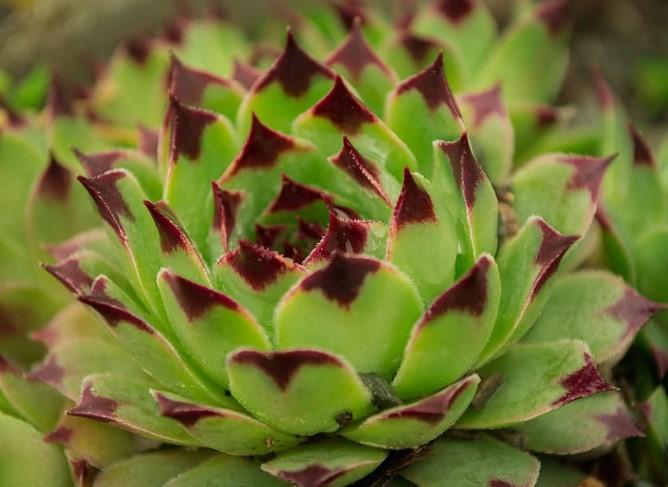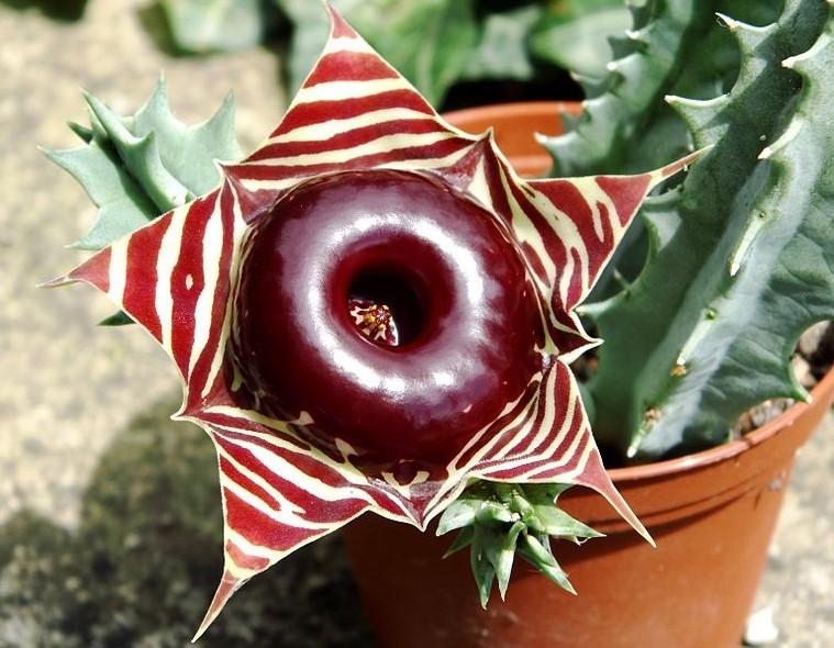 Se las llama comúnmente ojo de dragón, y es que las huernias son todo un género de crasas de pequeño tamaño que resultan muy vistosas, no solo por sus bonitos tallos de verde claro y cuerpo grueso, con dientes carnosos, sino también por las flores que le dan nombre, de llamativo granate y con forma de campana y con el centro más oscuro. Necesitan buena iluminación y un clima de entre 15 ºC y 30 ºC. Esta de la imagen es una Huernia zebrina.