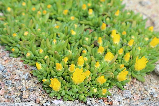 La planta de hielo o sigilosa arbustiva (Delosperma basuticum), pertenece al género Delosperma, que cuenta con alrededor de 100 especies de origen africano. Se trata de plantas de porte rastrero y de tamaño pequeño, con hojas suculentas de vistoso verde claro y con unas flores muy llamativas de un intenso amarillo, que pueden florecer durante prácticamente toda la temporada. Pese al sobrenombre de estas plantas suculentas con flores, solo pueden resistir heladas ocasionales, agradeciendo una ubicación de sol directo.