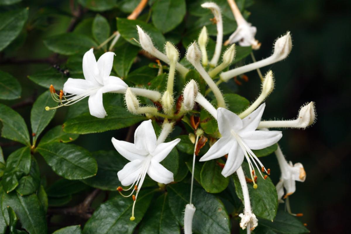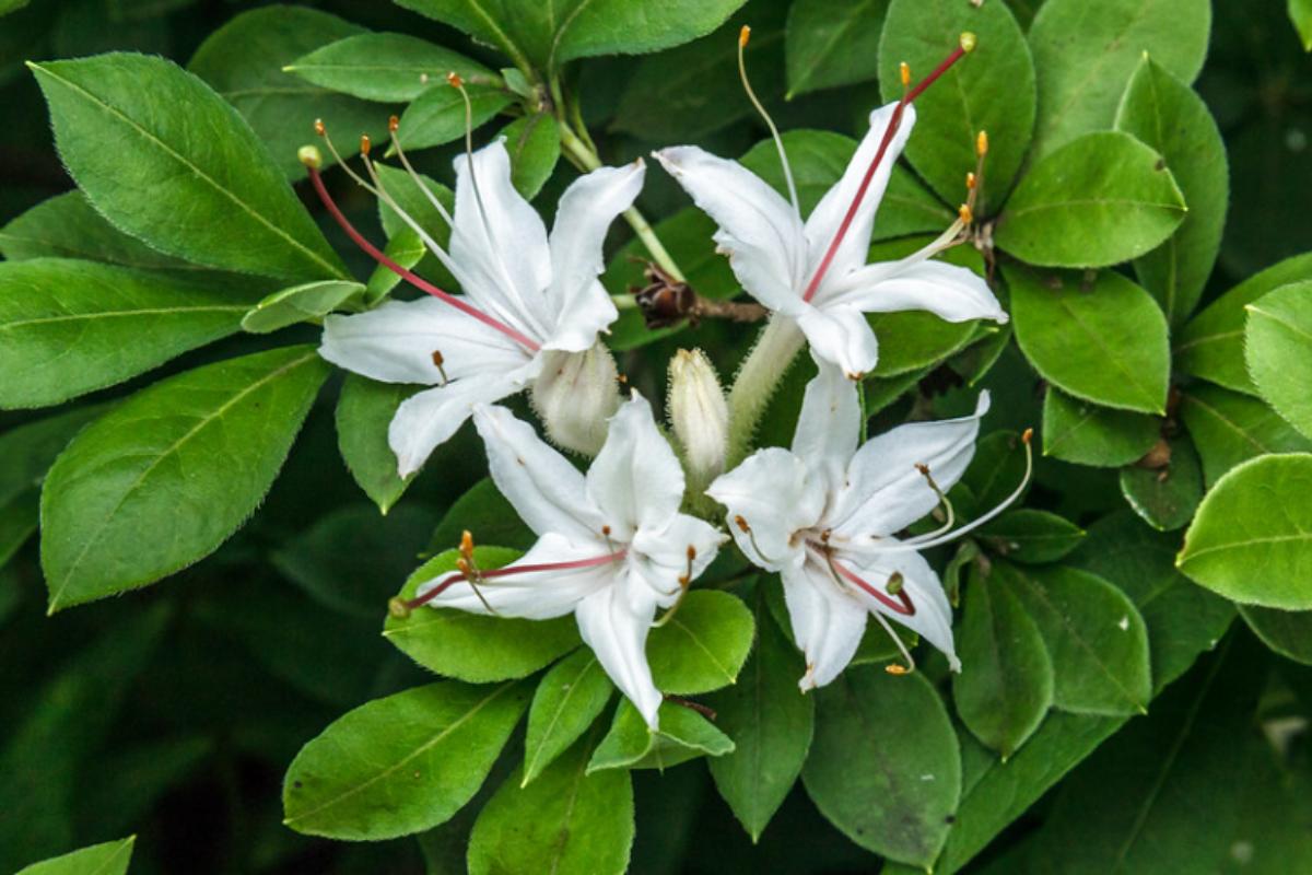 Rhododendron viscosum es un arbusto de 2 metros, que ofrece flores blancas muy fragantes, que duran desde el principio hasta el final del verano. Puede tolerar exposición solar completa, siempre y cuando el suelo retenga una buena cantidad de agua y no se seque.