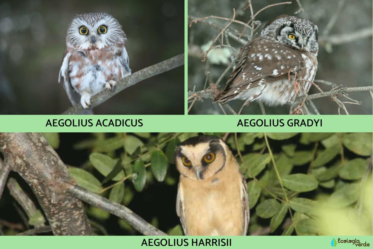 Este género, conocido como Aegolius, está conformado por aves que habitan en montañas y bosques, donde se alimentan de murciélagos, insectos y mamíferos pequeños. Su envergadura oscila entre los 16 y 27 cm. Las especies se distribuyen en Europa, Asia y América del Norte.