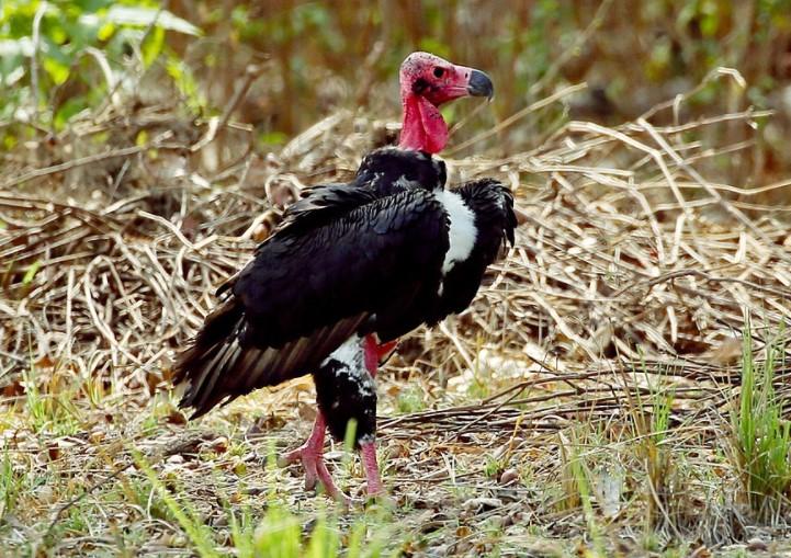 Sarcogyps calvus es también conocido como buitre rey negro. Su cabeza descubierta de plumas es de color rojo, de aquí su nombre. Suele encontrarse en zonas cercanas a asentamientos humanos, es de hábitos solitarios y su alimentación depende prácticamente de cadáveres del ganado. Esta especie se encuentra en peligro de extinción, pues su alimento principal, que solían ser animales ungulados, está desapareciendo. El mejoramiento en la gestión de residuos también los ha orillado a quedarse sin alimento. Habita en el Viejo Mundo, en la región de la India.