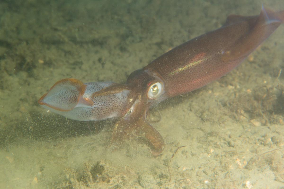 El calamar de arrecife (Sepioteuthis lessoniana) es una especie pequeña que habita en los arrecifes de coral y praderas marinas a poca profundidad en el océano Atlántico y el mar Caribe. Gracias a la abundancia de pigmentos en sus tejidos (cromatóforos), puede cambiar rápidamente de coloraciones y patrones (manchas, rayas, líneas) y camuflarse en su entorno. Además, en el caso de los machos, dicho patrón actúa como señal frente a otros machos que quieren cortejar a la hembra ya que estas son poliándricas, es decir, que toman varios machos como pareja durante el periodo de puesta.