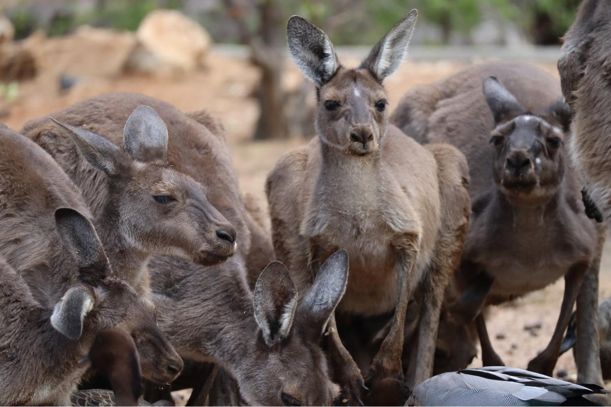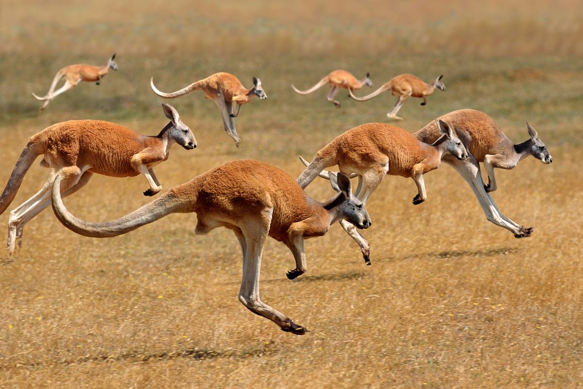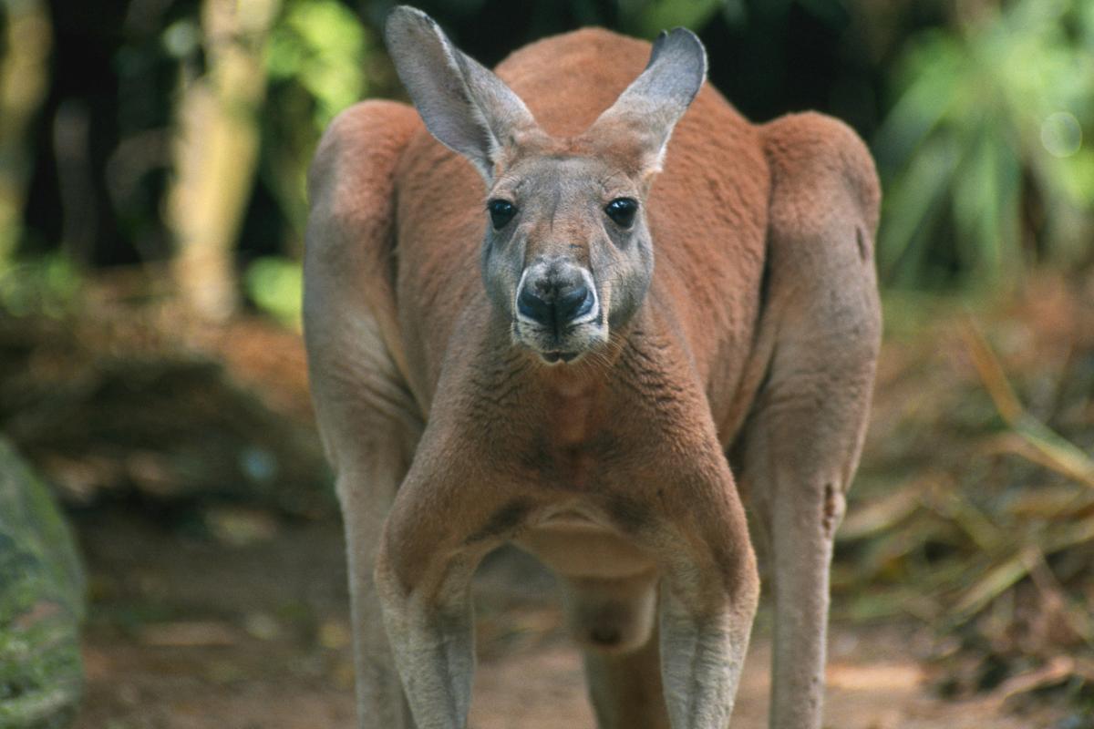El canguro rojo es el más grande de los marsupiales, encontrándose en gran parte de Australia, excluyendo áreas fértiles y selvas. Los machos pueden alcanzar hasta 1,8 metros de altura y pesar 90 kg, con pelaje rojizo y orejas largas. Habita en matorrales y pastizales, donde se alimenta principalmente de hierbas verdes, adaptándose a ambientes áridos. Según la Lista Roja de Especies Amenazadas de la UICN, Osphranter rufus, se encuentra categorizada como “Preocupación Menor”.