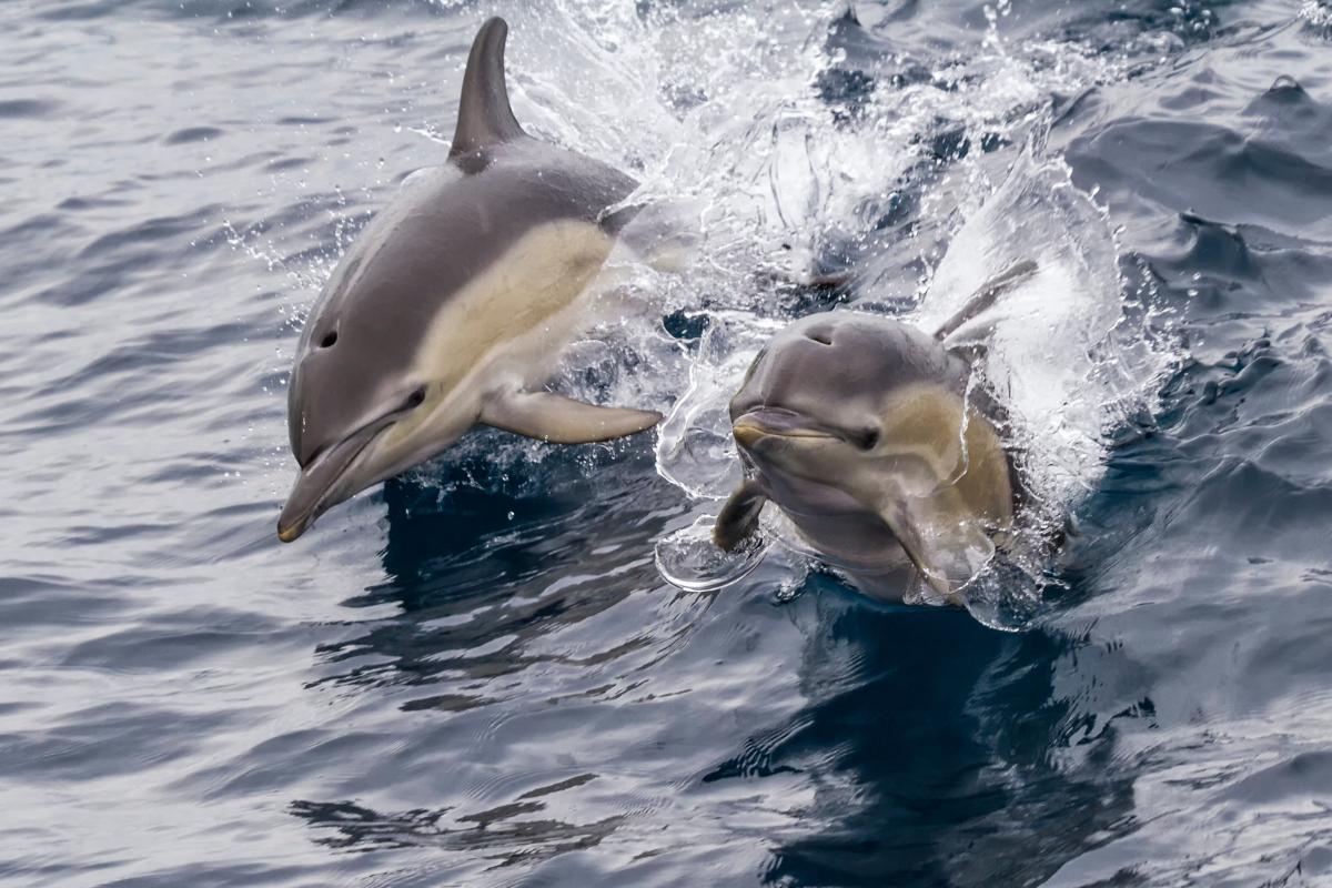 - Delfín común (Delphinus delphis): es cosmopolita de aguas tropicales y templadas. Tiene una coloración clara lateral que permite identificarlo, y es observarla cuando salta. Actualmente es una especie catalogada como en menor preocupación respecto a su posible extinción[6]. La primera imagen que verás aquí abajo es de un par de delfines de esta especie.