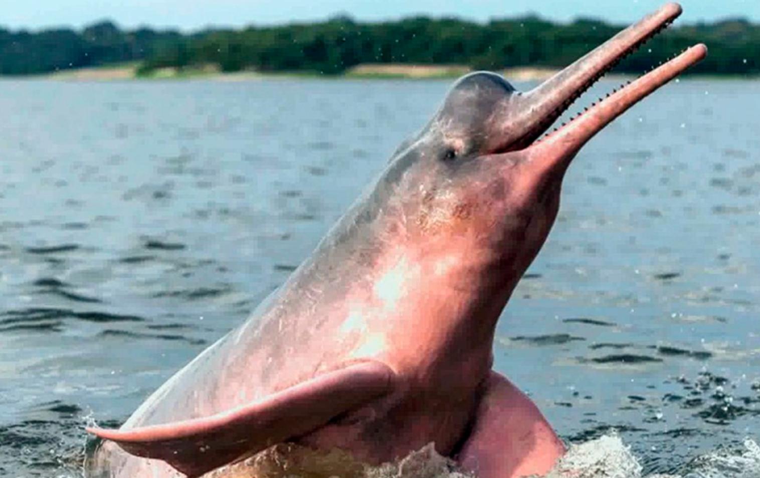 - Delfín rosa del Amazonas (Inia geoffrensis): la piel es rosada, carece de aleta dorsal y el hocico está ligeramente curvado hacia abajo. Mide de 1.8 a 2.5 metros de largo. Es e delfín de río más grande. Es originario del río Amazonas y de la cuenca del Orinoco. Es peculiar porque tiene la capacidad de mover la cabeza hacia los lados, lo que le ayuda a capturar a sus presas. Están amenazados a desaparecer, concretamente categorizados como especie en peligro de extinción actualmente[4]. Aquí puedes informarte sobre los Animales del Amazonas.