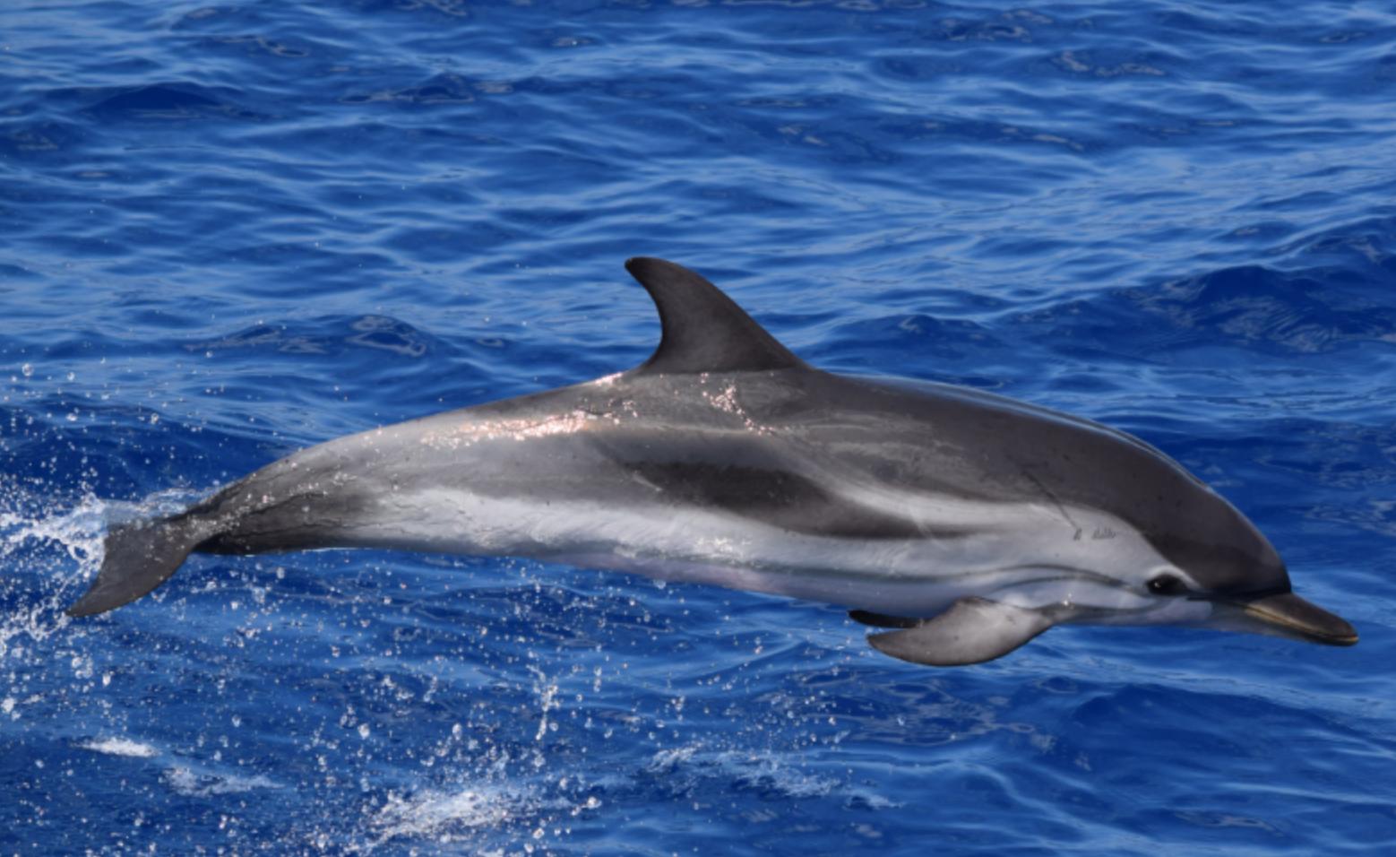 - Delfín listado (Stenella coeruleoalba): es muy común en el mar Mediterráneo, aunque también es cosmopolita de zonas tropicales y templadas. Tiene patrones laterales muy característicos en forma de listones claros. Se considera que no está en peligro de extinción y, de hecho, la preocupación por ello está catalogada como menor. La tercera imagen de aquí abajo es de un delfín de esta especie.