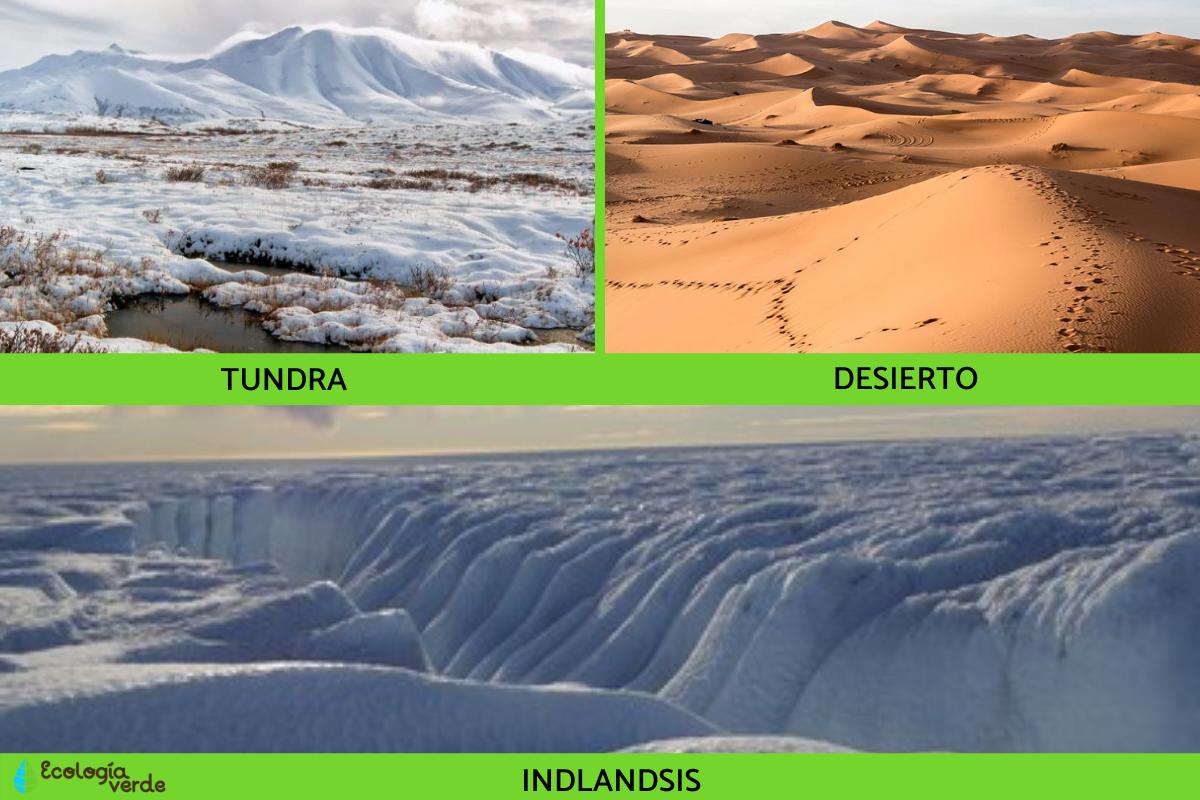 - Ecosistemas terrestres sin vegetación: puede que sí que la tengan, pero en estos casos es muy poca o casi inexistente. Nos encontramos con la tundra, el desierto e Indlandsis.