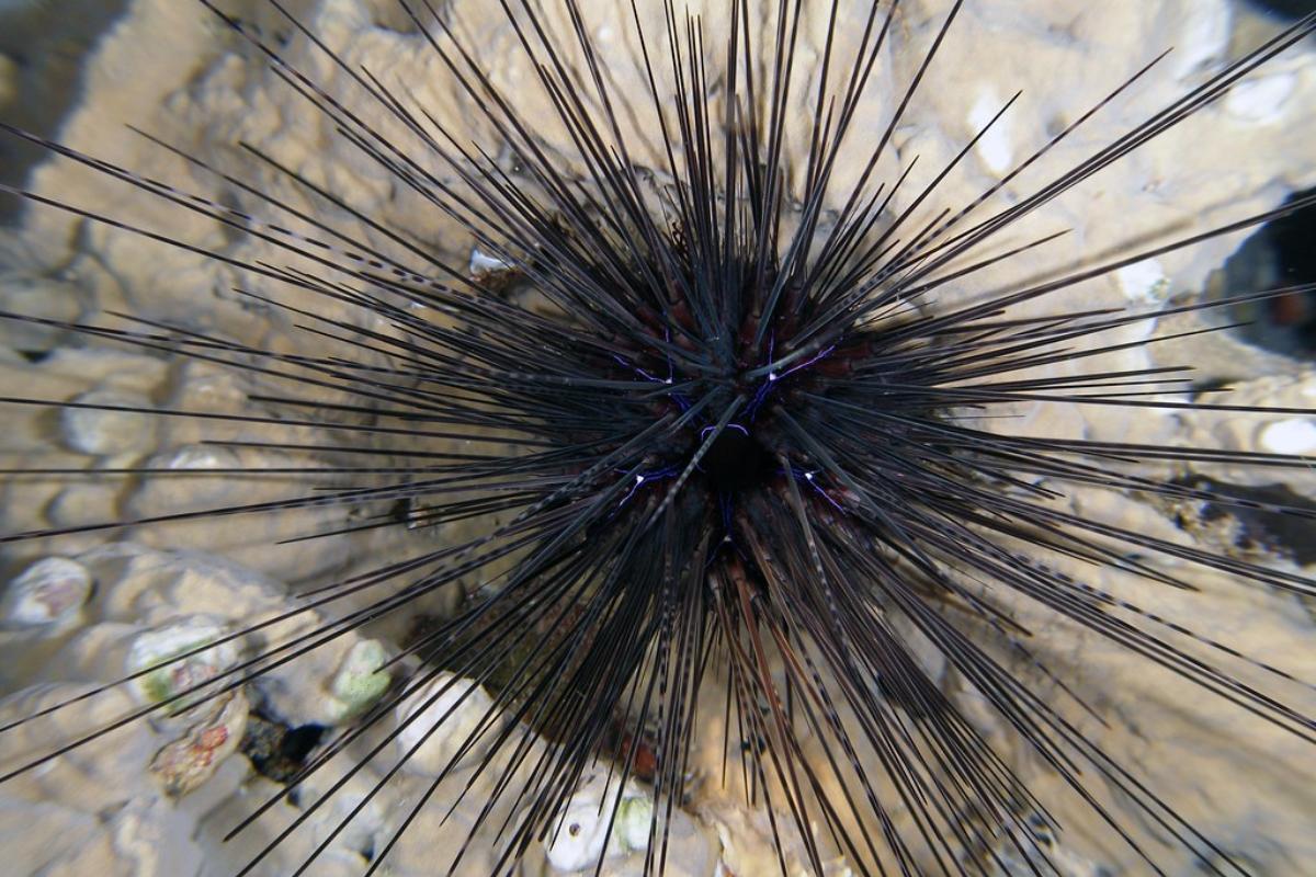 Este euechinoideo, Diadema antillarum, de forma globular tiene espinas negras muy largas, afiladas y frágiles con longitud de 10 centímetros. Estas son frecuentemente pisadas por turistas, pues estos erizos se asocian a arrecifes de coral. Si este es el caso, las púas pueden romperse dentro de la piel causando infecciones si no son removidas o, en el mejor de los casos, pueden ser absorbidas por el cuerpo.