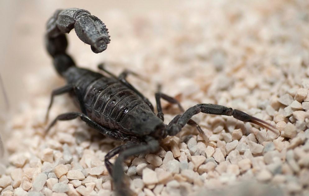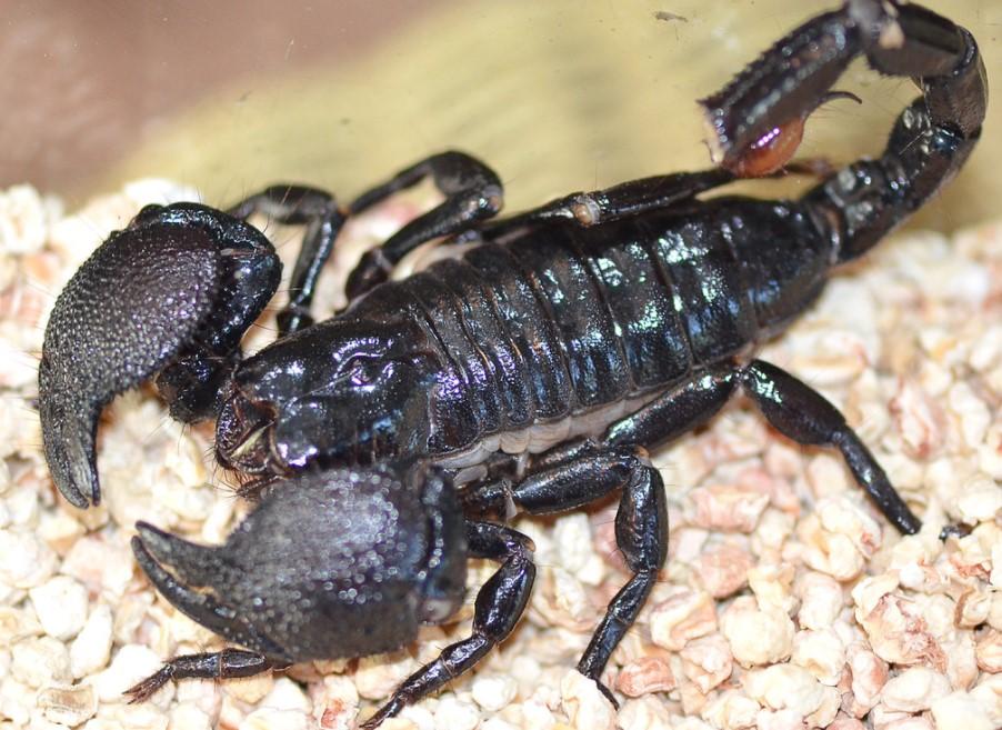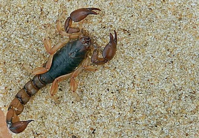 Este escorpión de cola negra (Androctonus bicolor) no solo presenta la cola negra, sino que todo su cuerpo es de coloración oscura y de aspecto robusto. Su distribución comprende África y Medio Oriente y su poderoso veneno afecta el sistema nervioso y puede llegar a ser letal.