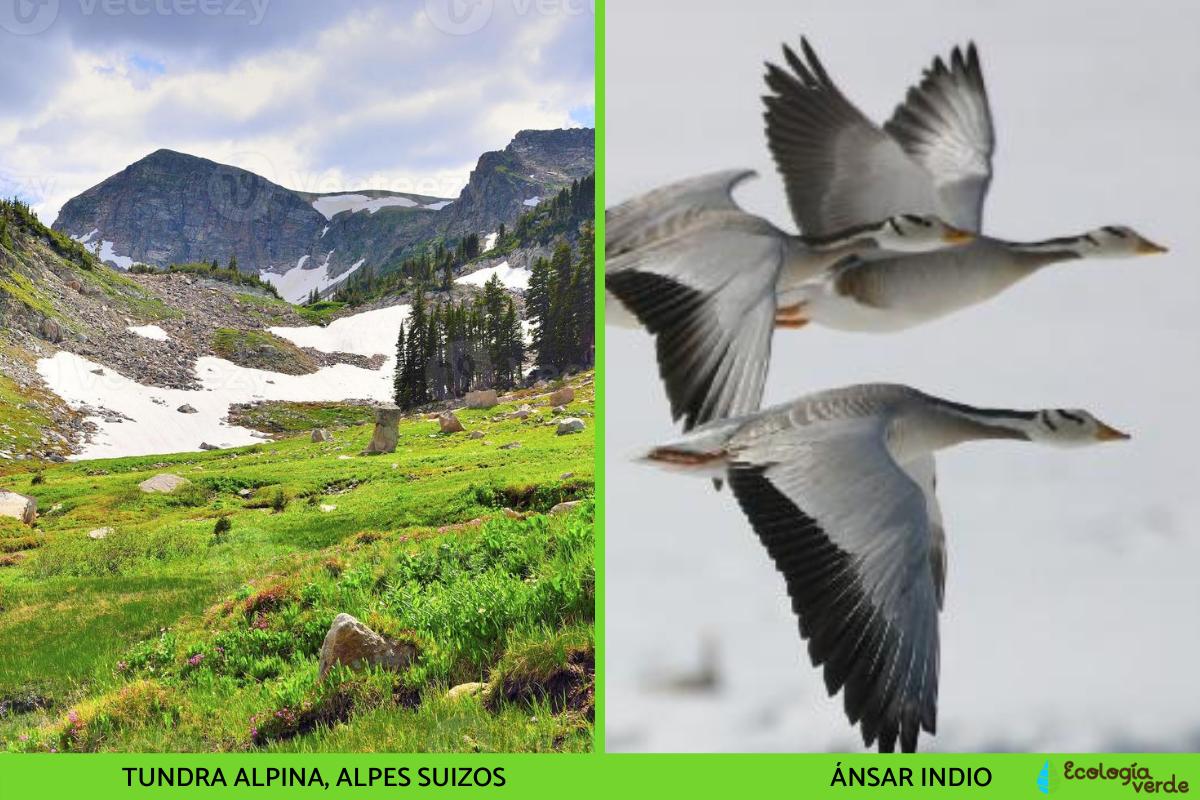 Un ejemplo de esto es el ánsar indio Anser indicus, que habita en las montañas nevadas del Tibet, bioma de tipo tundra alpina. Esta es el ave migratoria que más alto puede volar, alcanzando hasta 8.847 metros de altura. Aquí los vientos soplan a 300 kilómetros por hora y el oxígeno comienza a escasear.