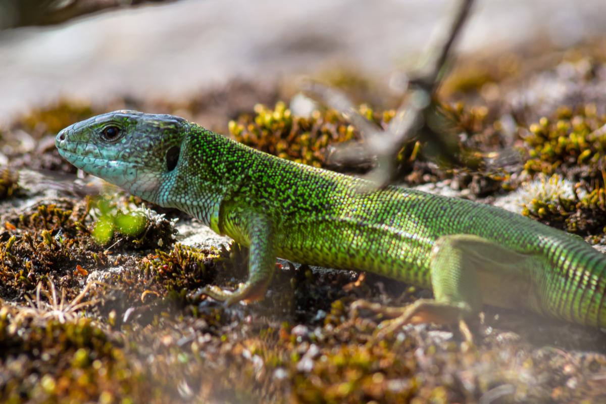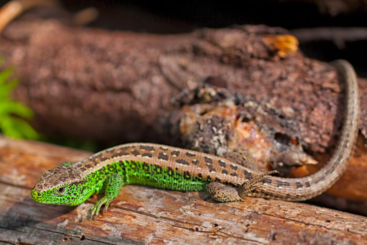 Perteneciente a la familia Lacertidae, el lagarto verde (Lacerta viridis) se distribuye en el continente europeo y asiático. Suele habitar en ambientes con densa vegetación arbustiva, bosques abiertos, márgenes de campos, terraplenes y matorrales. Los machos son verdes con manchas negras en el lomo, mientras que las hembras son verdes brillantes. A mediados de la primavera ambos sexos adquieren una coloración azulada en las mandíbulas, más frecuente en los machos.