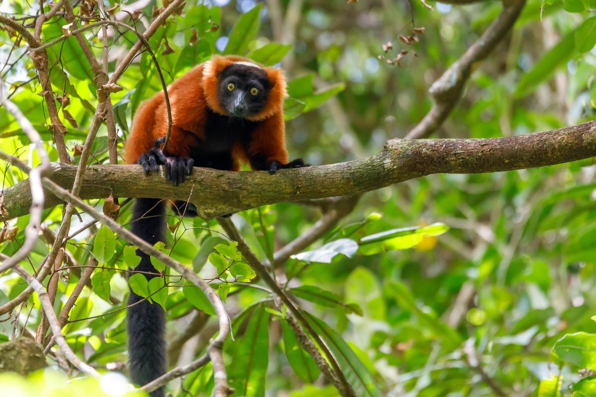 El lémur rufo rojo (Varecia rubra) es un primate de tamaño mediano endémico de Madagascar, habitando principalmente los bosques tropicales caducifolios de la península de Masoala. Con un peso de 3,5 a 4 kg y una longitud de aproximadamente 53 cm, se distingue por su pelaje rojizo, con una cara negra, vientre, cola y patas también oscuros, y un parche blanco en el cuello. Según la lista roja de IUCN, Varecia rubra se encuentra categorizado como "en peligro crítico de extinción".