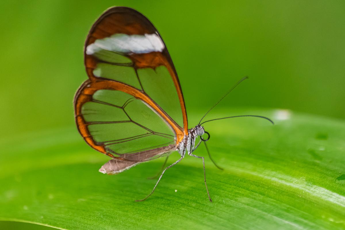 Esta espectacular mariposa nativa de Centroamérica destaca porque parece estar hecha de vidrio, pues sus alas son transparentes. Están surcadas por venaciones negras y márgenes pardos, y el resto transparente les ayuda a pasar desapercibidas entre las selvas tropicales.