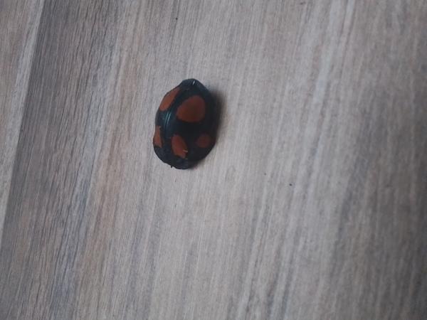 Otra mariquita con forma algo circular, los élitros generalmente son de colores negros y brillantes con un reborde alrededor de la base. Tienen manchas rojas en forma de coma sobre ellos y a los lados del pronoto.