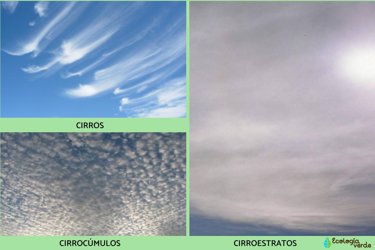 Las nubes altas son aquellas que se forman en latitudes medias y bajas y a altitudes por encima de los 6.000 metros. A tanta altura el aire está a una temperatura muy baja y cuenta con muy poca humedad, así que estas nubes están formadas principalmente por cristales de hielo. Acostumbran a ser delgadas y de color intensamente blanco.