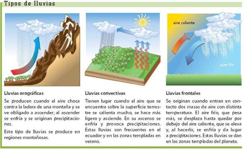El origen de las lluvias o precipitaciones está ligado al mecanismo por el cual se formaron las nubes de donde proceden. Estos son los tipos de precipitaciones según su origen: