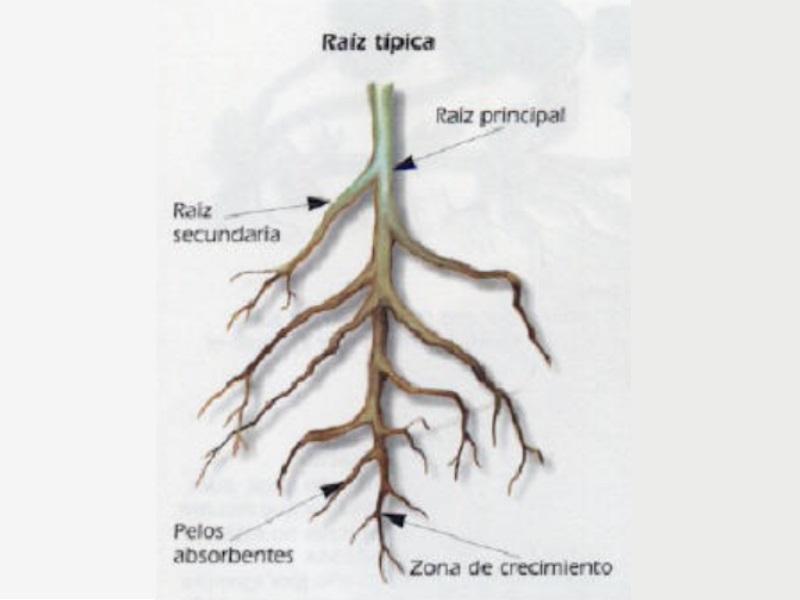 Las raíces son el primer órgano que la planta desarrolla al germinar. Crecen extendiéndose y ramificándose, normalmente bajo tierra, para cubrir todo el terreno posible y así aumentar la capacidad de absorción de agua y nutrientes de la planta, que realizan por medio de "pelos" absorbentes. Estos nutrientes son transportados luego al resto de la planta.