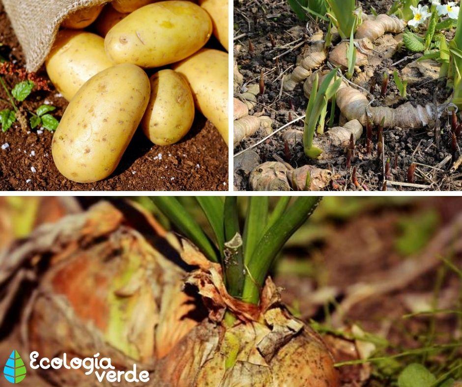 - Tubérculos: son de poca longitud y muy gruesos, y se caracterizan por almacenar sustancias de reserva y nutrientes. Cuentan con hendiduras, llamadas comúnmente ojos, que dan lugar a tallos aéreos. Algunos ejemplos de tubérculo son la patata, la mandioca, la maca y el tupinambo.