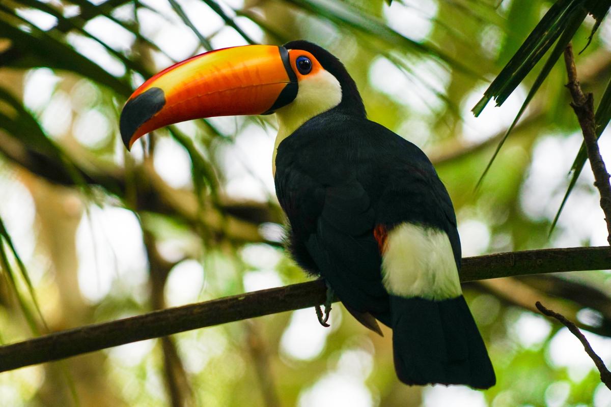 La especie conocida como tucán toco (Ramphastos toco) vive en gran parte de Sudamérica, desde el norte de Argentina hasta Brasil y Perú. Prefiere sabanas, bosques abiertos, plantaciones y áreas semiáridas. Es el tucán más grande: plumaje negro, garganta blanca y enorme pico naranja amarillento con punta negra. Pesa entre medio kilo y casi un kilogramo. Se alimenta de frutos, pero también come insectos, vertebrados y huevos de otras aves. Usa su largo pico para recolectar frutas.