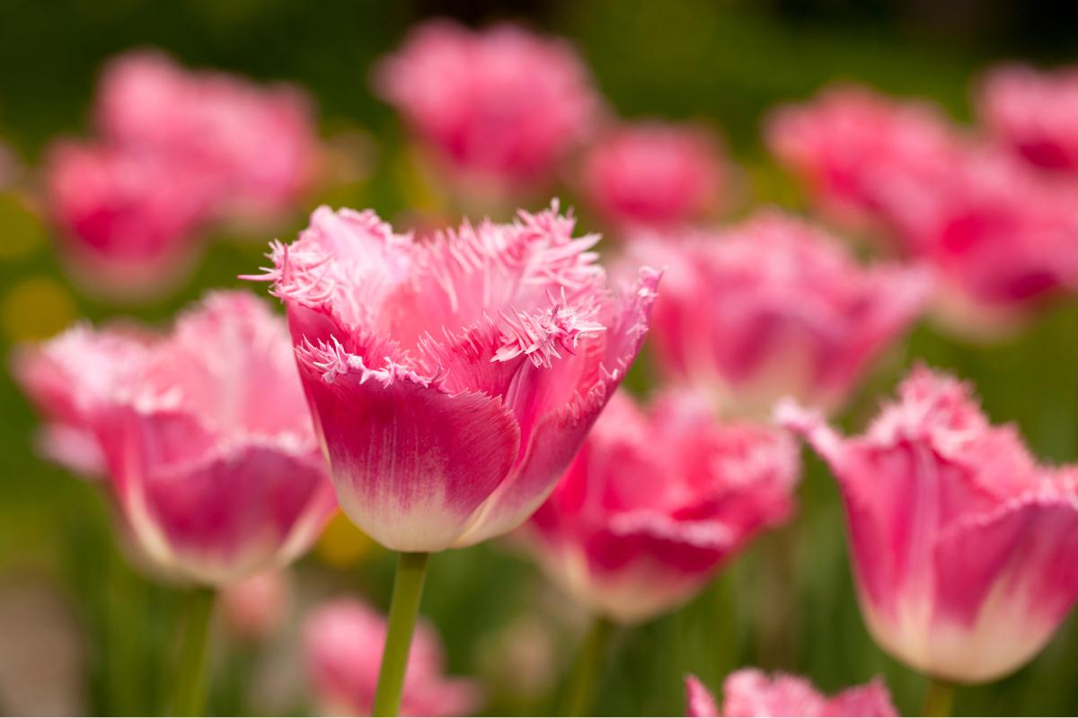 Este tulipán, que alcanza la considerable altura de hasta 40 cm, ofrece una corola sencilla de llamativo color rosado, con marcas blancas en el envés de sus pétalos, cerca de la base. Sin embargo, lo que hace tan especial a la variedad de tulipán fancy frills y le aporta un toque de distinción es el borde de sus pétalos, que muestran un relieve rizado inconfundible y muy estético, que recuerda a la ropa de estilo vintage.