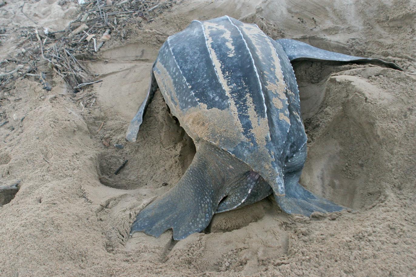 La tortuga laúd o de cuero (Dermochelys coriacea) tiene un caparazón liso y oscuro y vive en todos los mares, excepto en los polares. Es la tortuga marina más grande (1,80 m de largo, 2,5 m de envergadura y unos 300 kg). Estas son solo algunas de las características llamativas de esta especie. Las tortugas marinas viven la mayor parte del tiempo nadando en los océanos, saliendo únicamente las hembras para poner huevos. Aunque este estilo de vida parezca muy extremo, ellas están adaptadas a este estilo de vida con patas similares a remos con las que se impulsan bajo el agua.