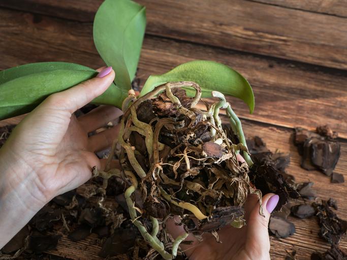 - Quita todo el sustrato, es decir la corteza de pino, para retirar la orquídea con mucho cuidado.
