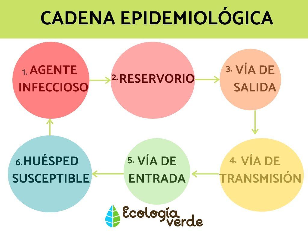 Ahora que ya conocemos los tres elementos de la triada ecológica, es necesario resaltar el modelo o ruta que siguen los agentes infecciosos desde la fuente de infección hasta los huéspedes. Dicho modelo de interrelaciones recibe el nombre de cadena epidemiológica, la cual permite conocer todos y cada uno de los diferentes eslabones y elementos que intervienen (directa o indirectamente) en el desarrollo de una enfermedad y su consecuente mecanismo de transmisión.