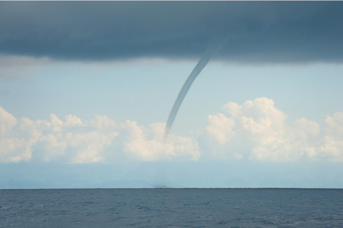 Una tromba marina es un fenómeno meteorológico que consiste en un remolino de viento sobre un cuerpo de agua, como océanos. Se forma cuando condiciones atmosféricas cálidas y húmedas favorecen la convección, asociada comúnmente con nubes de tormenta marinas, como los cumulonimbos. La rotación del aire se intensifica, extendiéndose desde la base de la nube hacia abajo y conectando con la superficie del agua. La presencia de una columna nubosa revela su existencia. Aunque generalmente son menos intensas que los tornados terrestres, las trombas marinas aún pueden representar peligros para embarcaciones cercanas a la zona de formación.