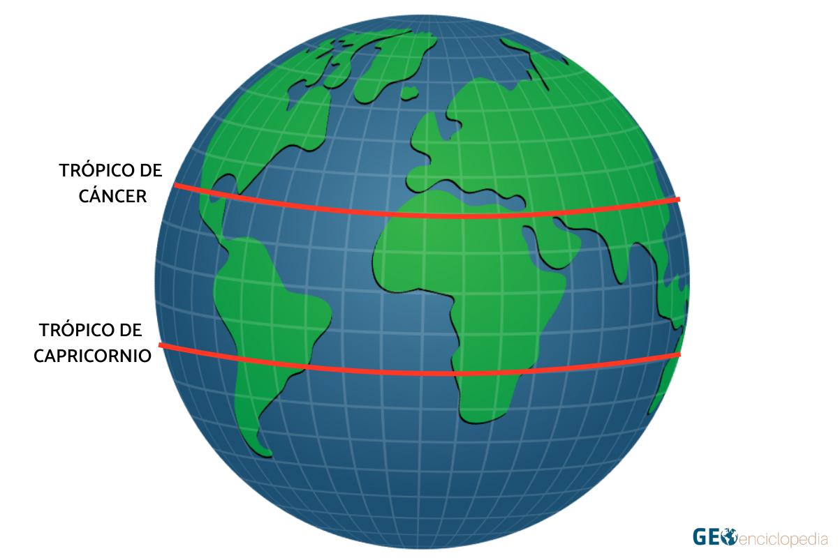 - El trópico de Cáncer: está ubicado aproximadamente a 23,5 grados de latitud norte, cruzando países como México, Sahara Occidental, Mauritania, Mali, Argelia, Níger, Libia, Egipto, Arabia Saudita, India, Birmania y China.