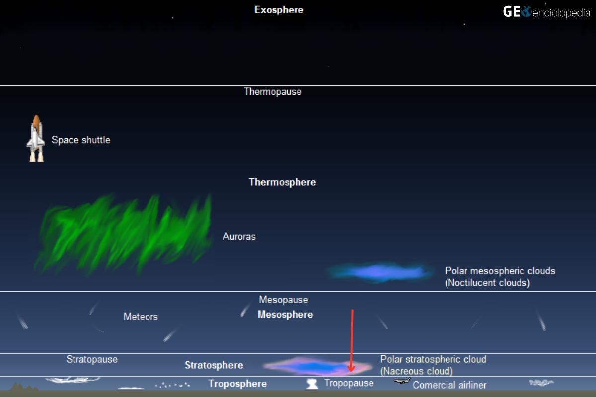 - Tropopausa: marca el límite entre la troposfera y la estratosfera y es una zona de estabilidad donde la temperatura deja de descender.