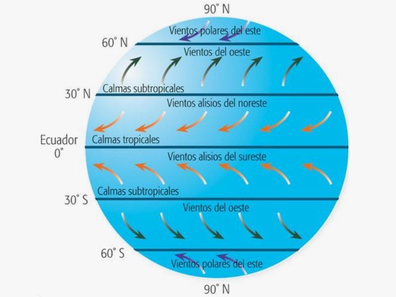- El efecto Coriolis es lo que provoca que estos vientos no soplen de forma perpendicular sino oblicua, así como de que sus sentidos en los dos hemisferios sean parcialmente invertidos.