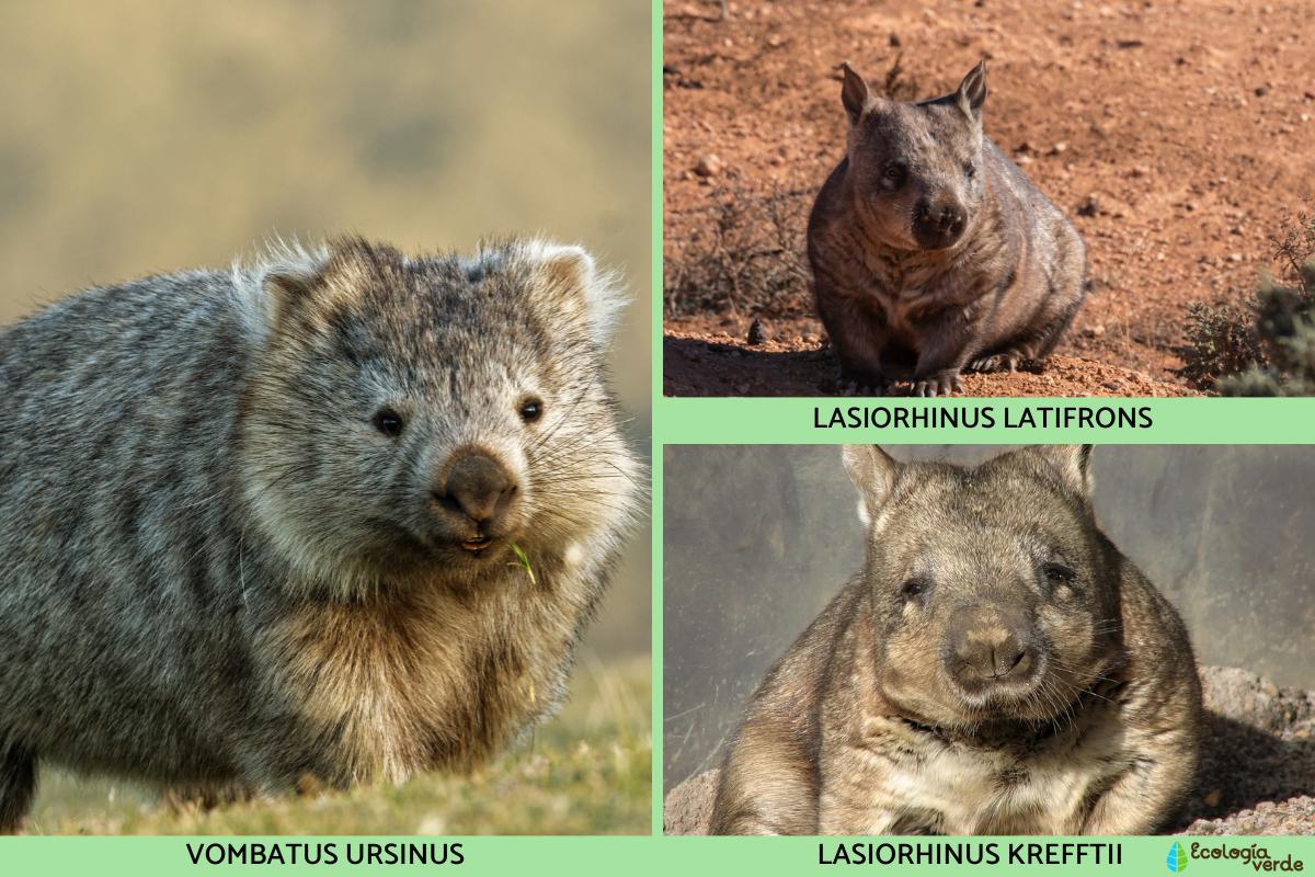 - Wombat de nariz peluda del sur (Lasiorhinus latifrons): pesa entre 24 y 32 kg y alcanza hasta 90 cm de longitud. Su pelaje es más sedoso y de un tono grisáceo, y se encuentra en las zonas más secas de Australia del Sur.