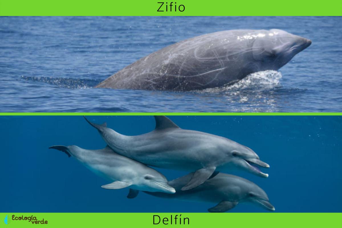 - La diferencia principal entre zifios y delfines radica en su dentición. Los delfines tienen entre 60 a 100 dientes, mientras que los zifios solamente se presentan en machos y solamente en un par y todo tienen dientes vestigiales.