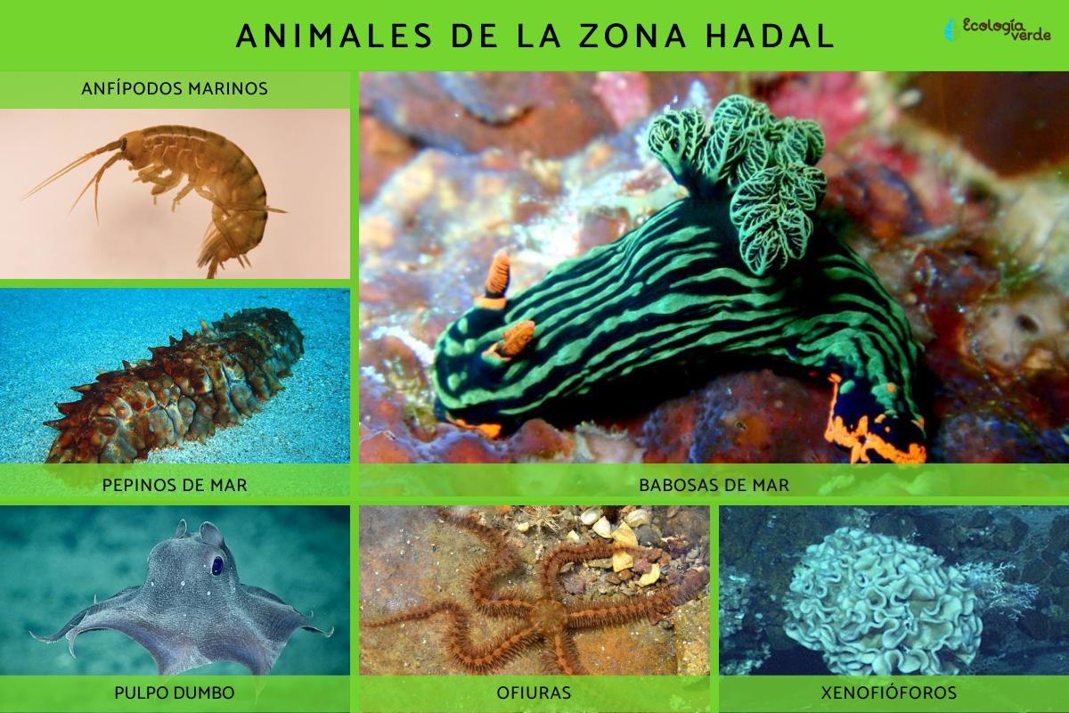 A pesar de que la diversidad de los organismos marinos disminuye a medida que aumenta la profundidad, la zona hadal posee vida. La mayoría de las especies que forman parte de este sitio, poseen adaptaciones a las condiciones extremas como a las bajas temperaturas y las presiones elevadas, por ejemplo: