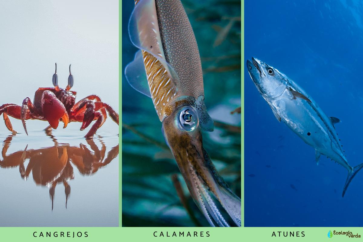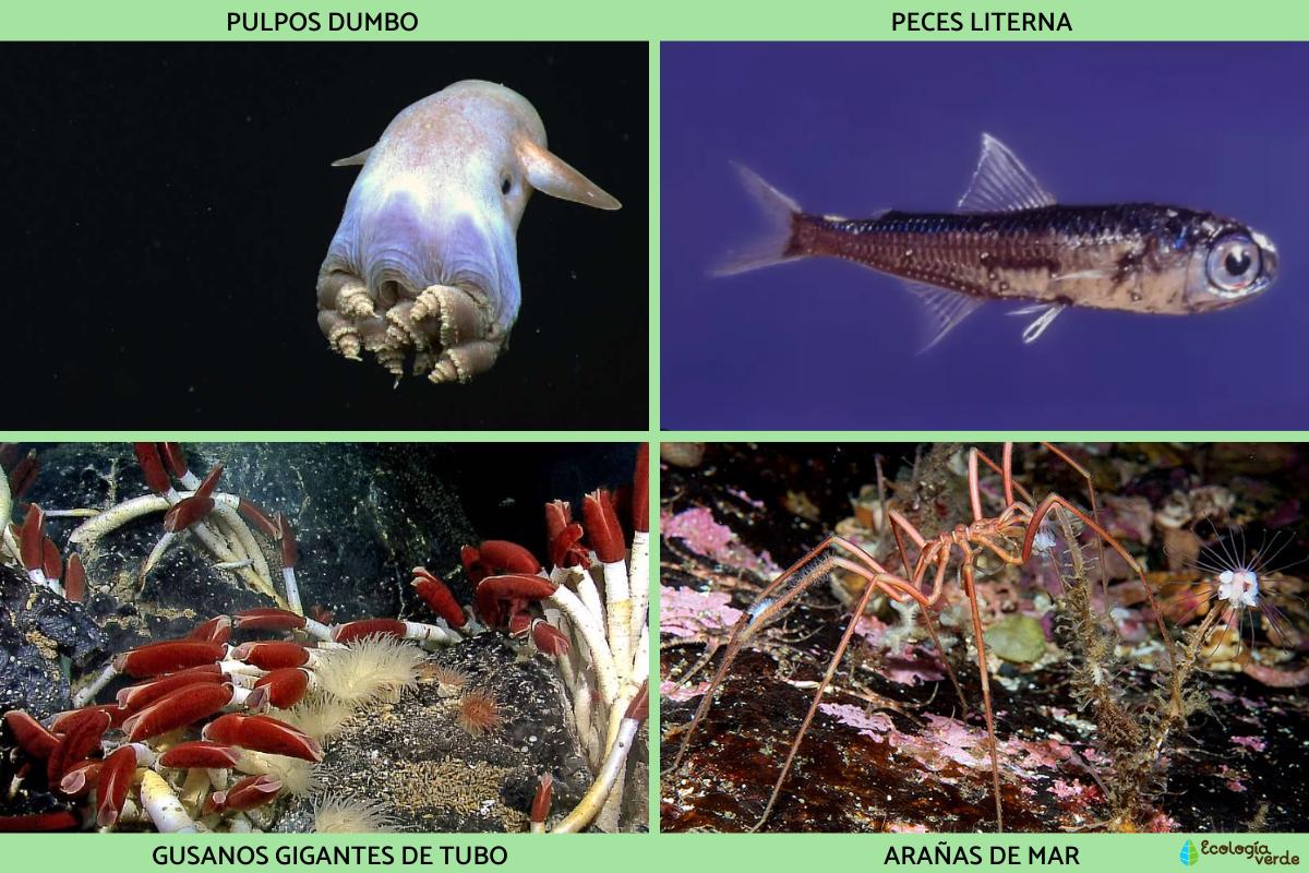 - Cefalópodos, como pulpos dumbo (género Grimpoteuthis) y calamares gigantes (género Architeuthis).